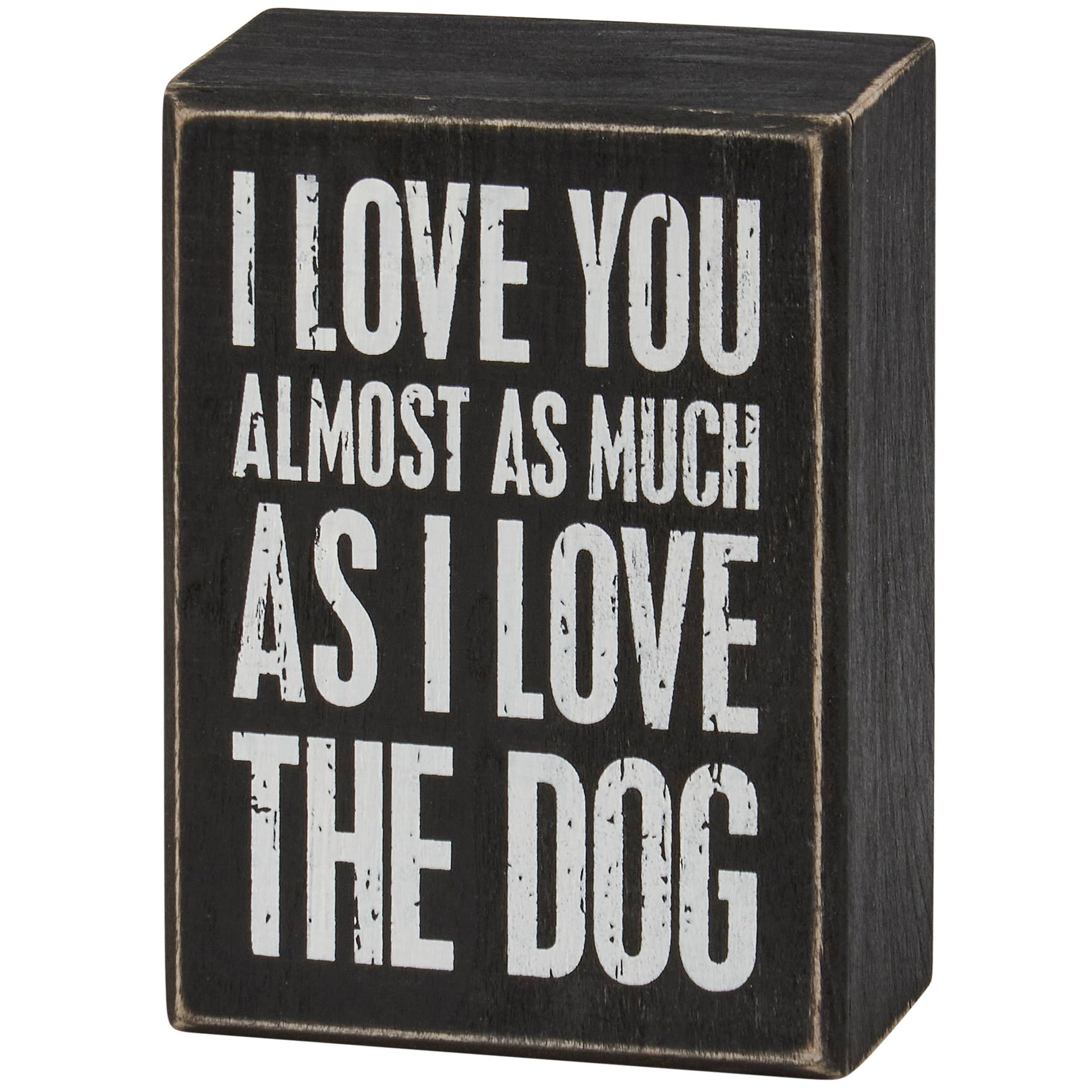 A classic black and white wooden box sign from our Box Sign Collection displaying a humorous love-themed sentiment that reads "I Love You Almost As Much As I Love The Dog." Box sign features distressed details with coordinating black color on sides and back. Our Love You Almost As Much box sign is easy to hang or can free-stand alone. A fun love-themed home accent great for gifting that can be easily displayed in any home or work space.